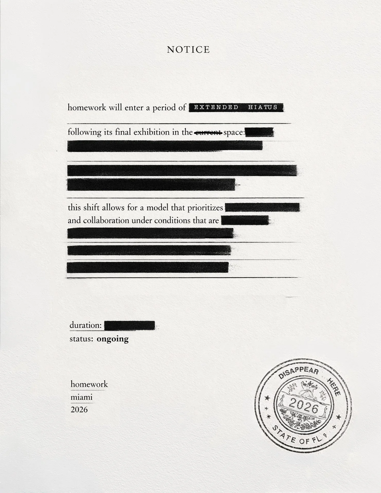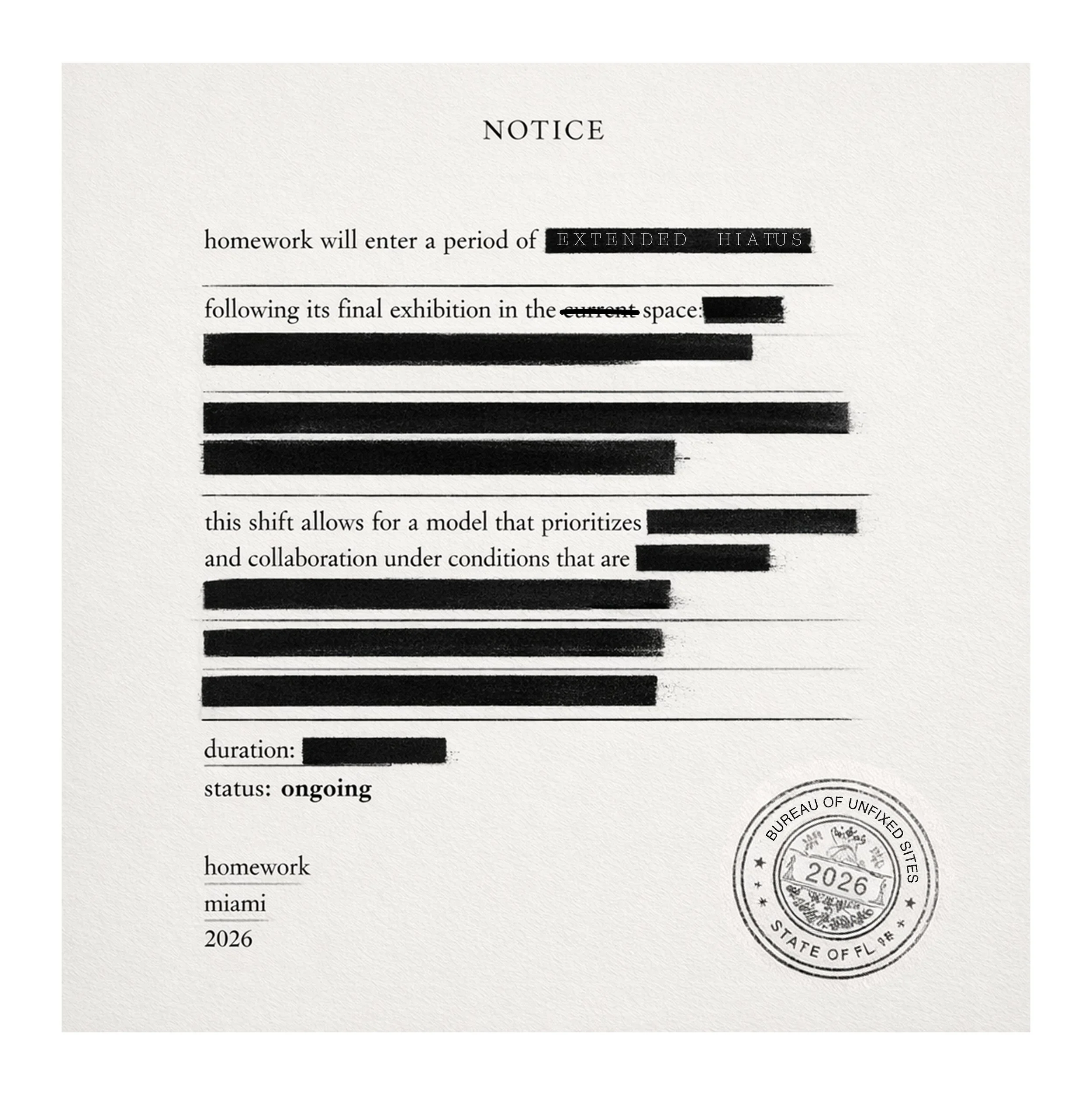 Following the final exhibition in our former space, homework will enter a period of extended hiatus.