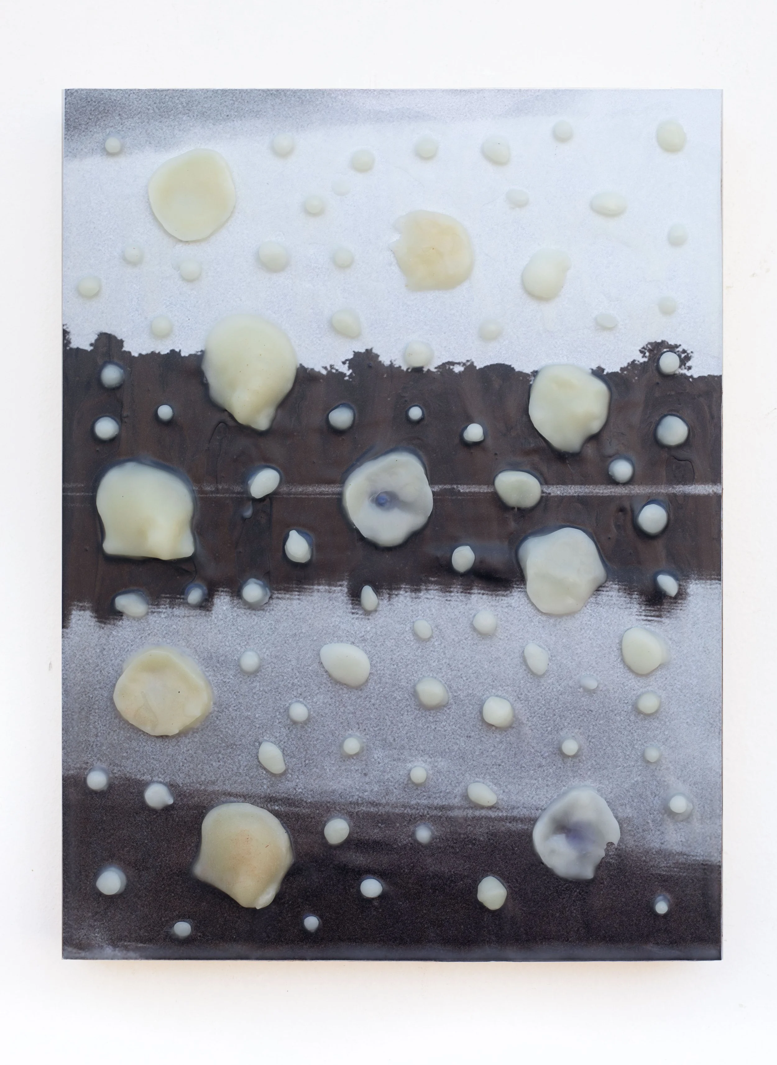 A diptych photograph from the artist’s personal archive of the Caroní River, layered with molds of pearls and shells, all covered with a coating of beeswax. It reflects two key aspects of their current research, centered on the geographic and material relationships between the Paria Peninsula—where they grew up in Venezuela—the Orinoco and Caroní rivers, and Santo Domingo. Each of these locations holds a history that predates colonization and was radically transformed by extraction economies. The exploitation of pearls and gold, along with their export point in Santo Domingo, establishes a connection to the artist’s migratory experience, imagining a future landscape that proposes a sensuous interaction with the natural world.